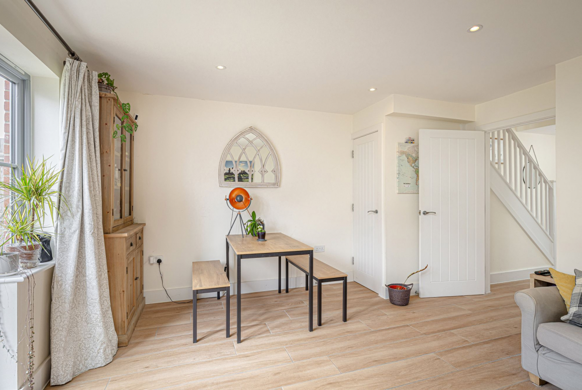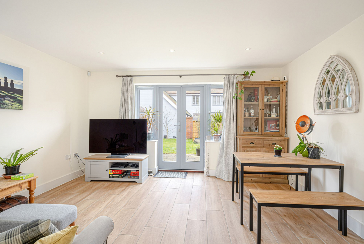 Step inside and you’ll immediately appreciate the bright, neutral finish and the practical layout. The ground floor benefits from underfloor heating and attractive ceramic tiled flooring, creating a warm and welcoming feel. A hallway leads to a cloakroom/WC and a neatly arranged kitchen to the front, perfectly sized for everyday cooking with plenty of storage and worktop space. To the rear, the sitting/dining room is the heart of the home: a generous, light-filled space with French doors opening straight onto the garden, ideal for relaxed evenings, entertaining friends, or simply enjoying the view.