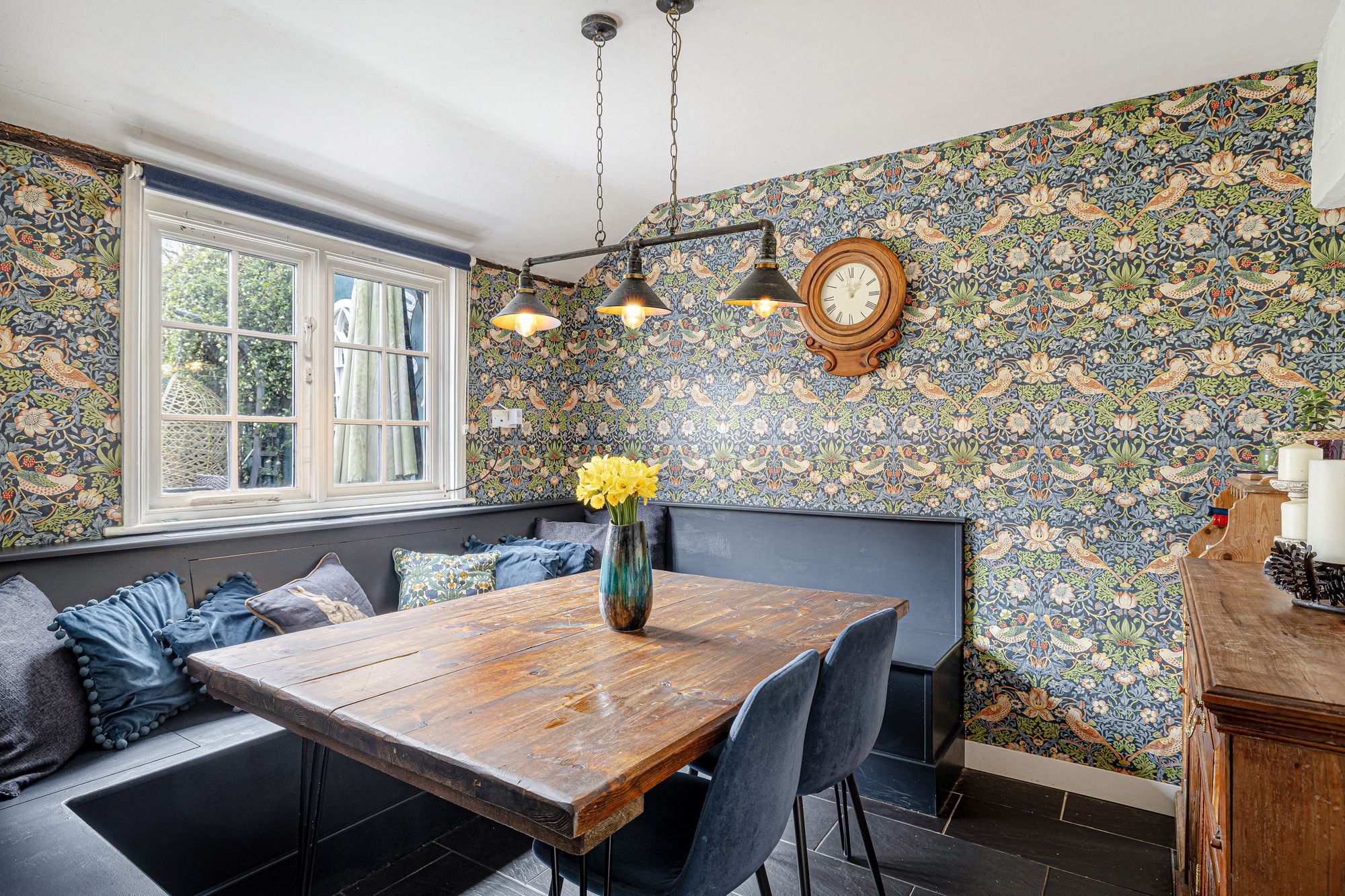 The kitchen sits at the heart of the home, combining timeless style with practicality. It features dark shaker cabinetry, a butler sink, slate flooring, and a statement range cooker. Open to the kitchen is a fantastic breakfast/dining space, complete with built-in banquette seating and character lighting, making it the perfect spot for everyday dining, homework, or entertaining friends.