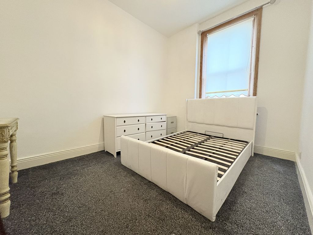 A spacious and characterful first floor flat set within a handsome period terrace on Queen Alexandra Road. With three bedrooms, a refitted kitchen and a surprisingly substantial loft space, the property provides both practicality and flexibility. The living room is a bright and welcoming space, offering excellent proportions for everyday living and relaxation. Its open connection through to the kitchen creates a natural flow between the spaces while still allowing each room to retain its own identity. The kitchen has been stylishly refitted with contemporary handleless cabinetry, integrated oven and hob, stainless steel extractor and mosaic tiled splashback. The clean, modern finish is complemented by a sliding barn-style door which adds a touch of character to the space. A practical advantage of the layout is the inclusion of both a separate WC and a modern shower room. The shower room is finished with warm-toned tiling and features a walk-in shower, vanity unit and heated towel rail. The three bedrooms are all well-balanced. The principal bedroom sits to the front of the property and enjoys a bay window, creating a bright and spacious room. The second bedroom provides another comfortable double, while the third bedroom offers flexibility as a guest room, nursery or home office. Above, the loft space adds an additional dimension to the property. Accessed via a hatch from the landing, the area is boarded with exposed beams and provides excellent storage with further potential for a variety of uses. Externally, the property benefits from a private rear yard with brick outbuilding, providing a low-maintenance outdoor space.