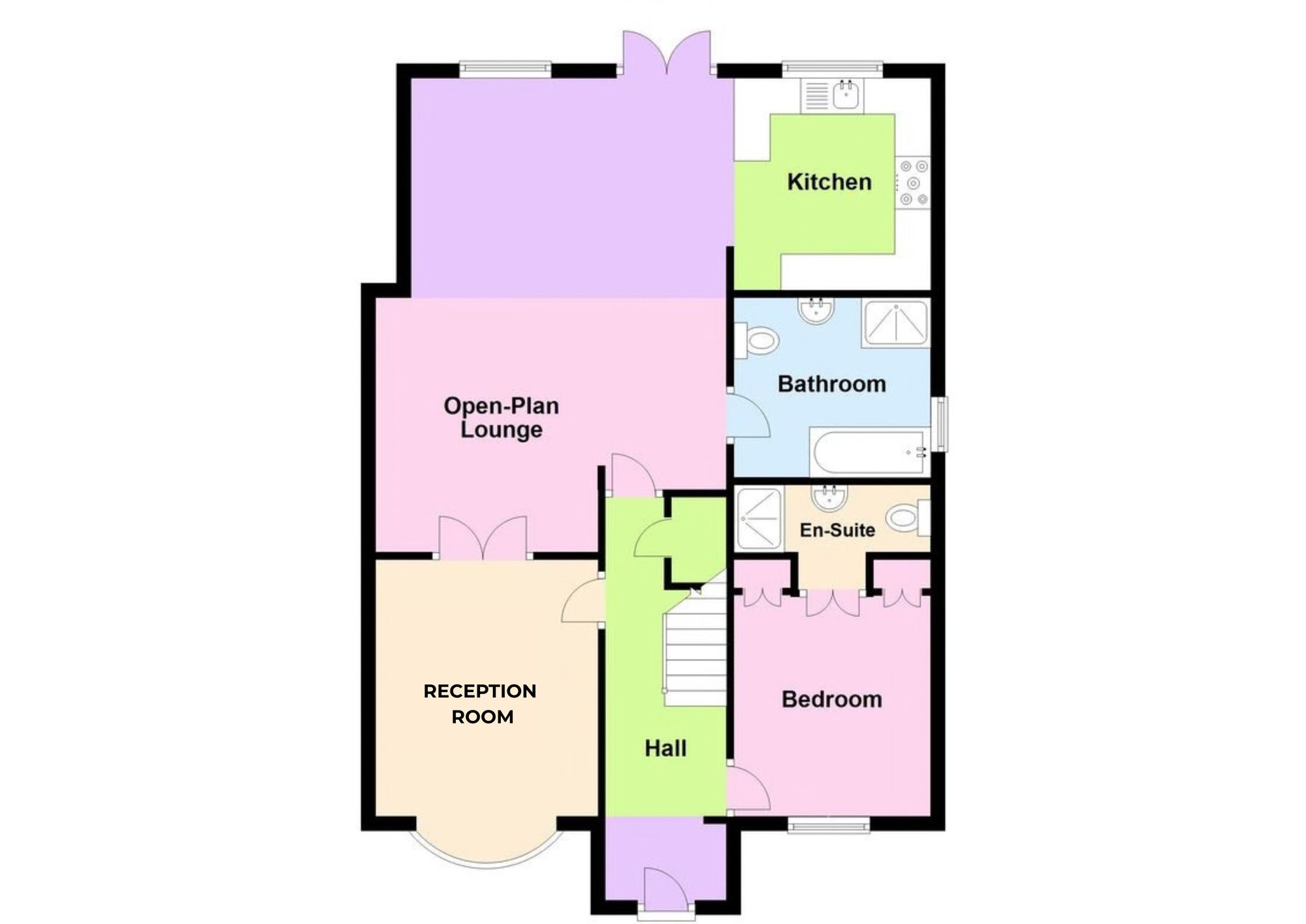 The property is entered via an entrance hall with tiled flooring, stairs rising to the first floor and a useful under-stairs storage cupboard. To the front of the home is a reception room featuring a double-glazed bay window, chimney breast, radiator and TV point, with double doors leading through to the main open-plan living space.