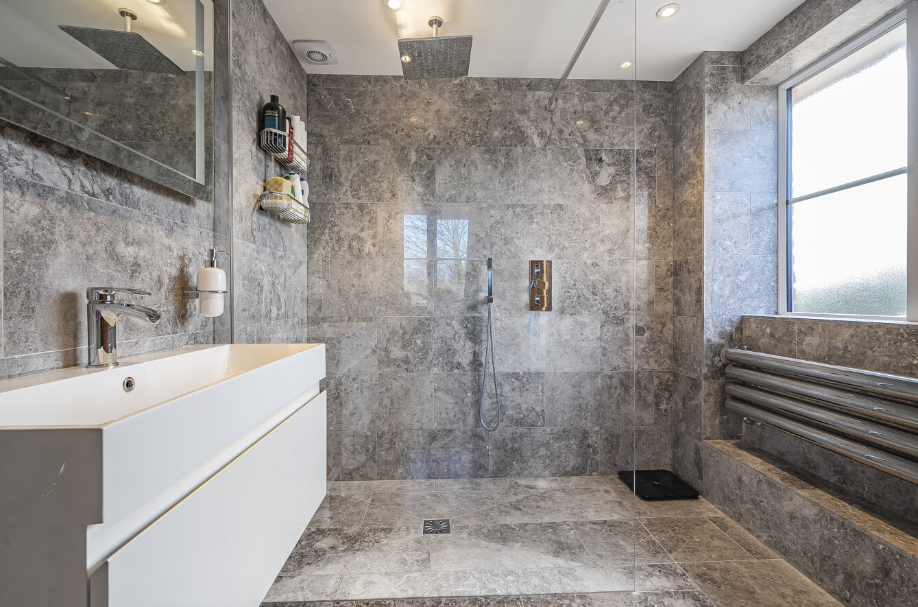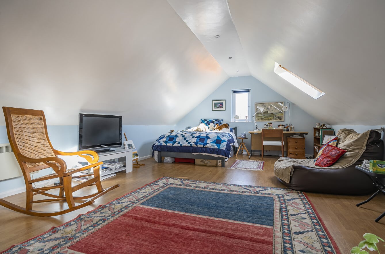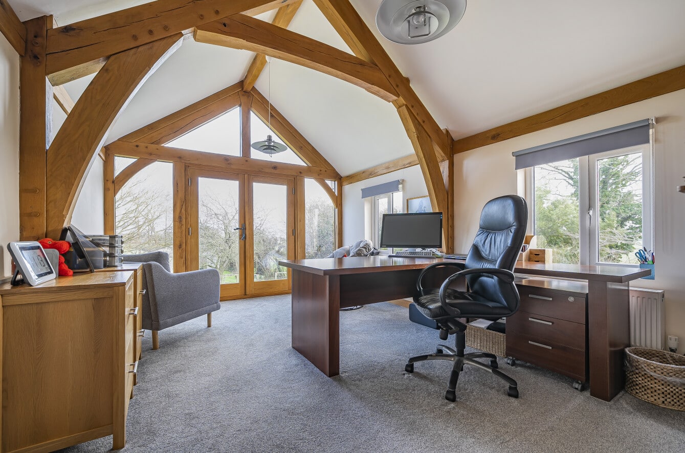 The first floor is equally impressive, featuring a master bedroom suite with a dressing area and en-suite shower room. The room enjoys dual-aspect views over the gardens. There are three additional bedrooms, along with a family bathroom. The oak-framed extension also houses a spacious office with a Juliet balcony, offering spectacular views of the gardens and surrounding countryside.