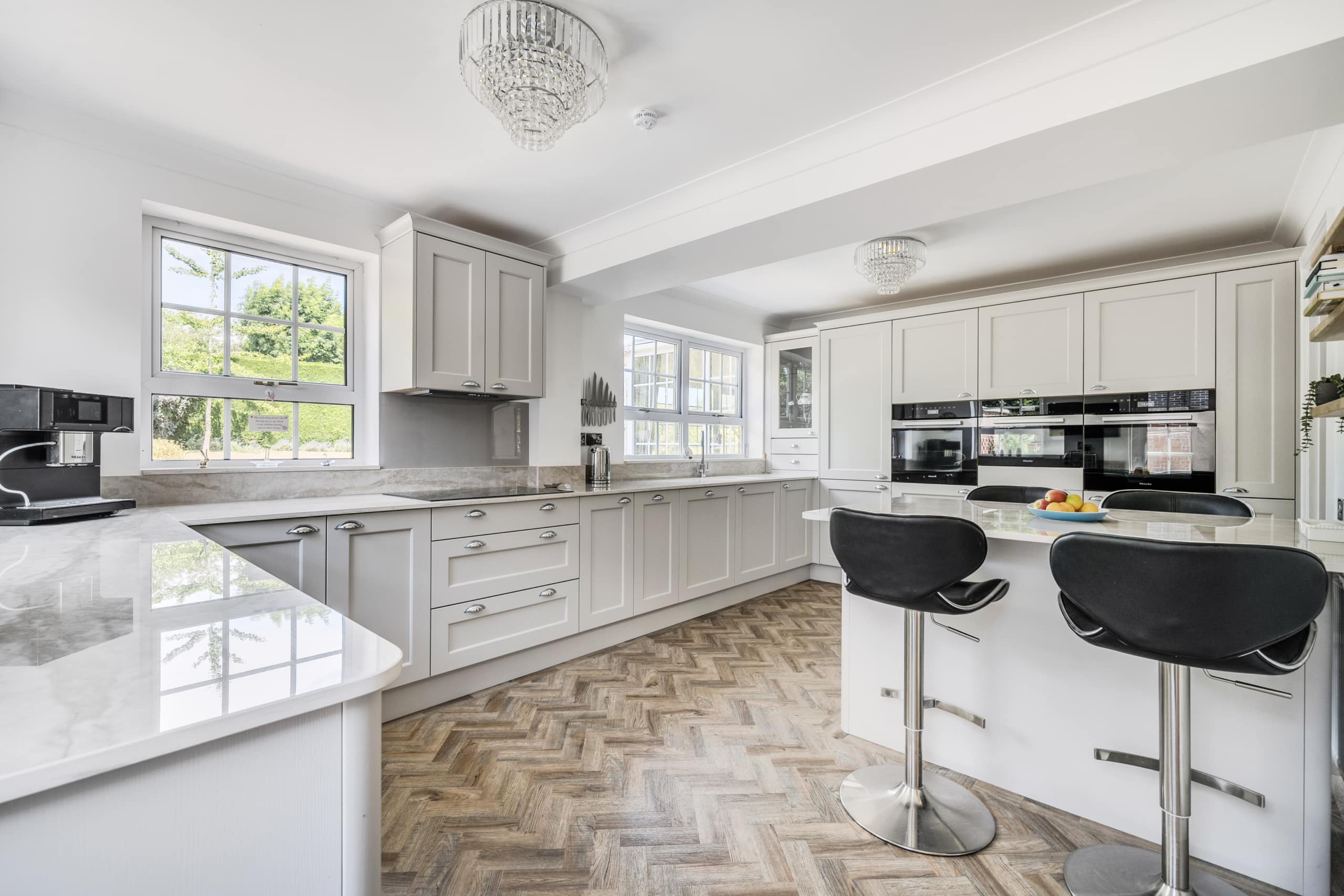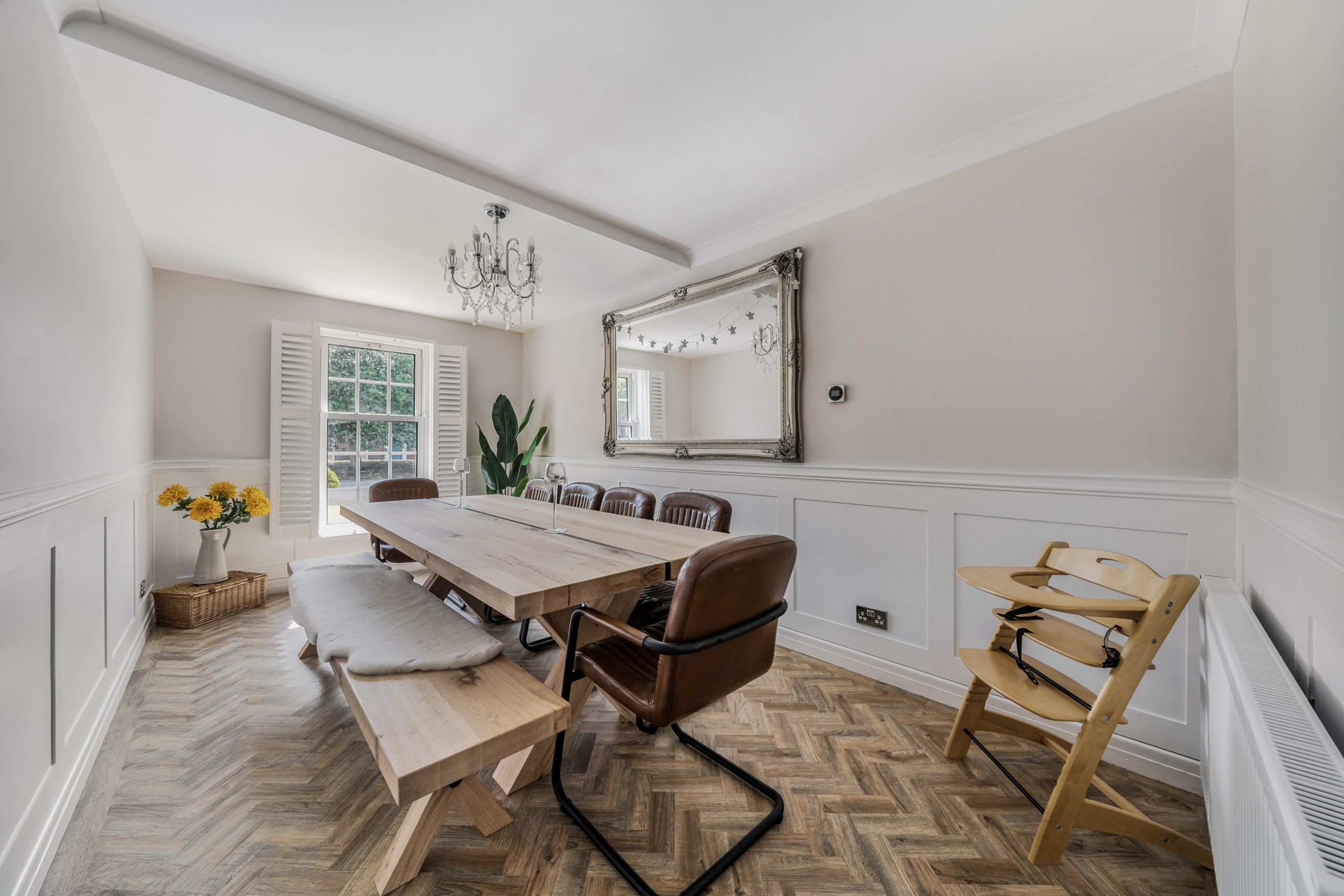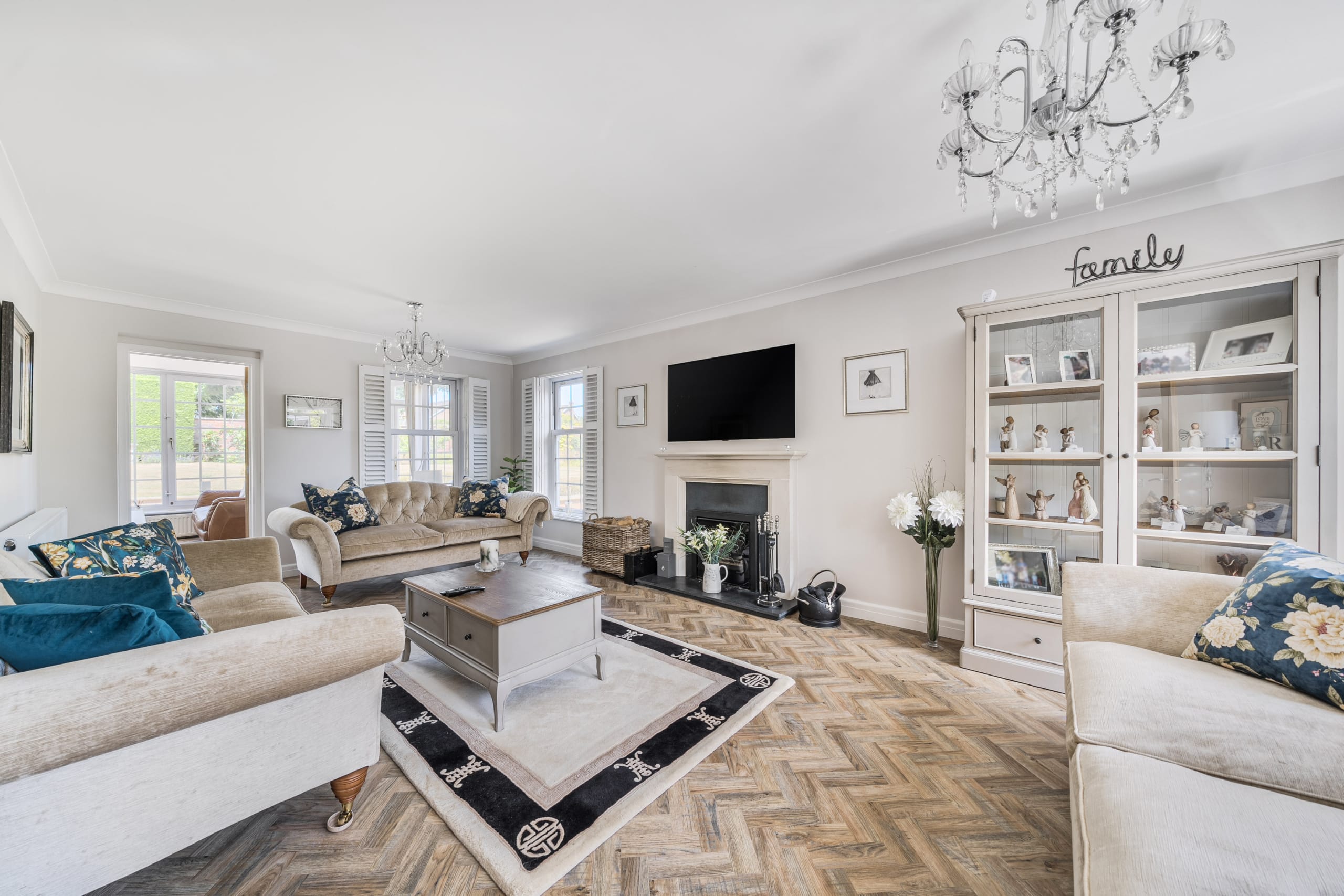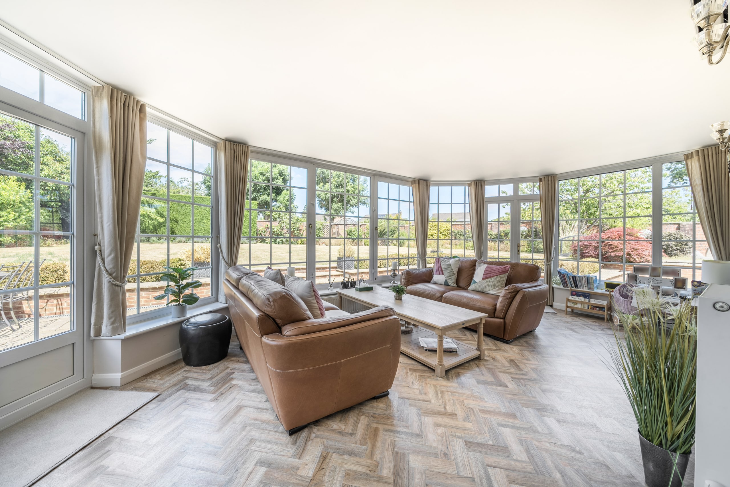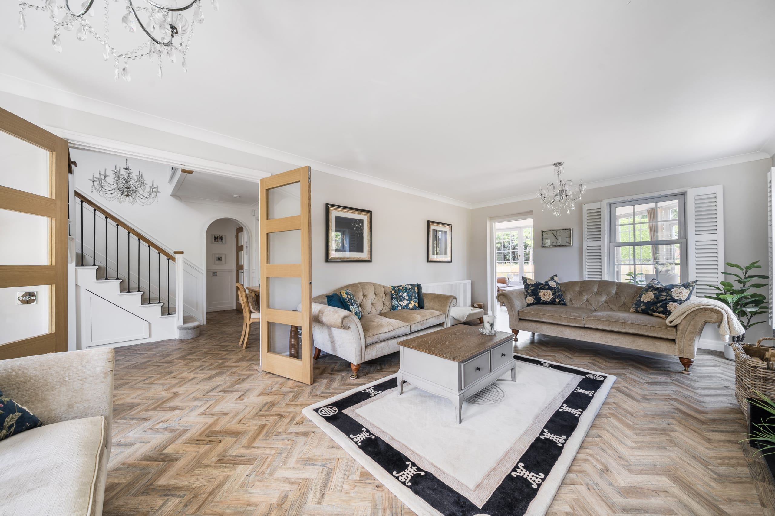 Upon entry you are greeted by a welcoming entrance hall with a stunning herringbone floor which runs throughout the downstairs space. The main reception room allows for plenty of natural light with its several windows, the fire place is a real focal point and a great feature for the colder months. The second reception room is of great size as it incorporates the previous conservatory space. The roof has been altered so the room can be used all year round with both heating and air conditioning. A seperate dining room is located a little further down, a fantastic space to host those Sunday dinners. The kitchen is a beautiful space featuring quartz worktops and Miele appliances which flow through to the utility room. The double garage can be accessed via the utility. A well-presented w/c completes the ground floor accommodation.